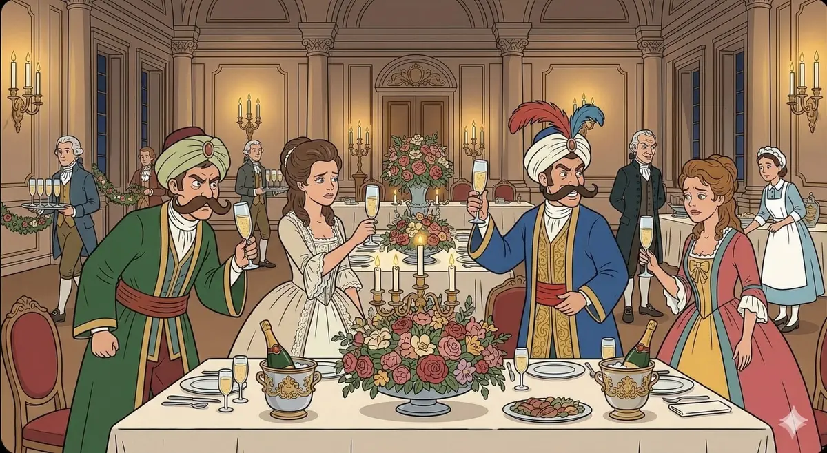 Don Alfonso and Despina orchestrate a lavish double wedding banquet with breathless efficiency in "Fate presto, o cari amici," servants bustling about with flowers and champagne. The two new couples raise their glasses in the glittering toast "E nel tuo, nel mio bicchiero," pledging to drown past sorrows in the wine of new love, though Guglielmo mutters darkly that he wishes it were poison. The celebration sparkles on the surface, but underneath, every heart is conflicted: the sisters feel a lingering guilt, and the men nurse wounds that no amount of festivity can heal.