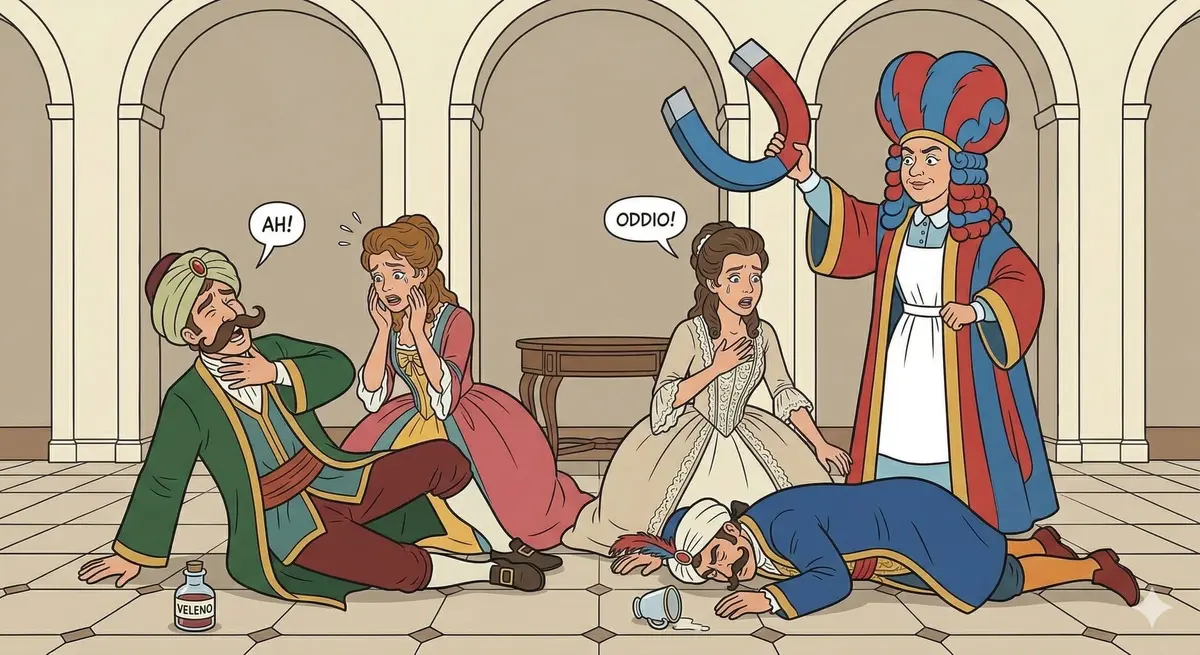 Desperate to break through the sisters' resistance, the disguised suitors stage a dramatic scene: they pretend to swallow arsenic, collapsing in theatrical agony in the quintet "Ah, che tutto in un momento." The terrified sisters rush to their side, and in an aside duet, "Prendero quel brunettino," they begin to confess to each other that these strangers are not entirely unattractive. Despina arrives disguised as a pompous doctor wielding a giant magnet, supposedly the latest Mesmeric cure, and 'revives' the dying men in the uproarious Act 1 Finale. As the suitors awaken and beg for kisses as their reward, the sisters waver but hold firm, though their defenses are visibly cracking. The curtain falls with everyone's emotions in turmoil.