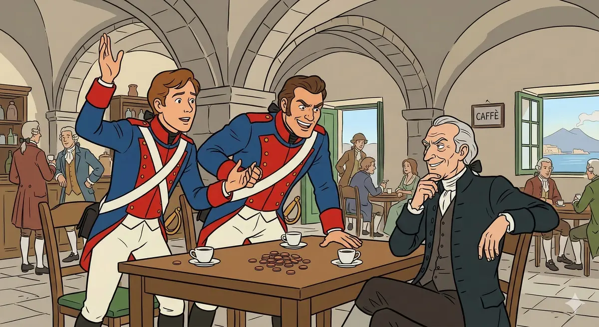 In a Naples coffee house, two young officers, Ferrando and Guglielmo, boast passionately about the faithfulness of their sweethearts in the spirited trio "La mia Dorabella." The old philosopher Don Alfonso listens with a sardonic smile, then drops his bombshell: he bets them a hundred gold coins that their beloveds, like all women, can be seduced within twenty-four hours. In "E la fede delle femmine," he mocks their naive trust as a fairy tale. Outraged but supremely confident, the young men accept the wager and gleefully plan how they will spend their winnings in "Una bella serenata," never suspecting that Don Alfonso's experiment will upend everything they believe about love.
