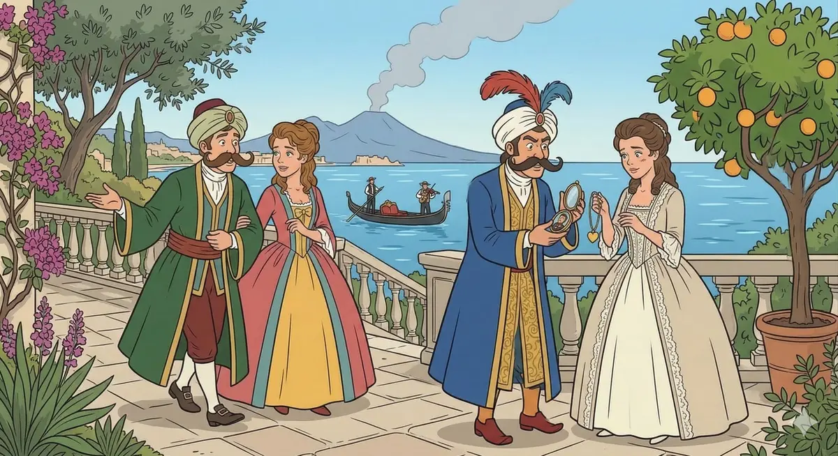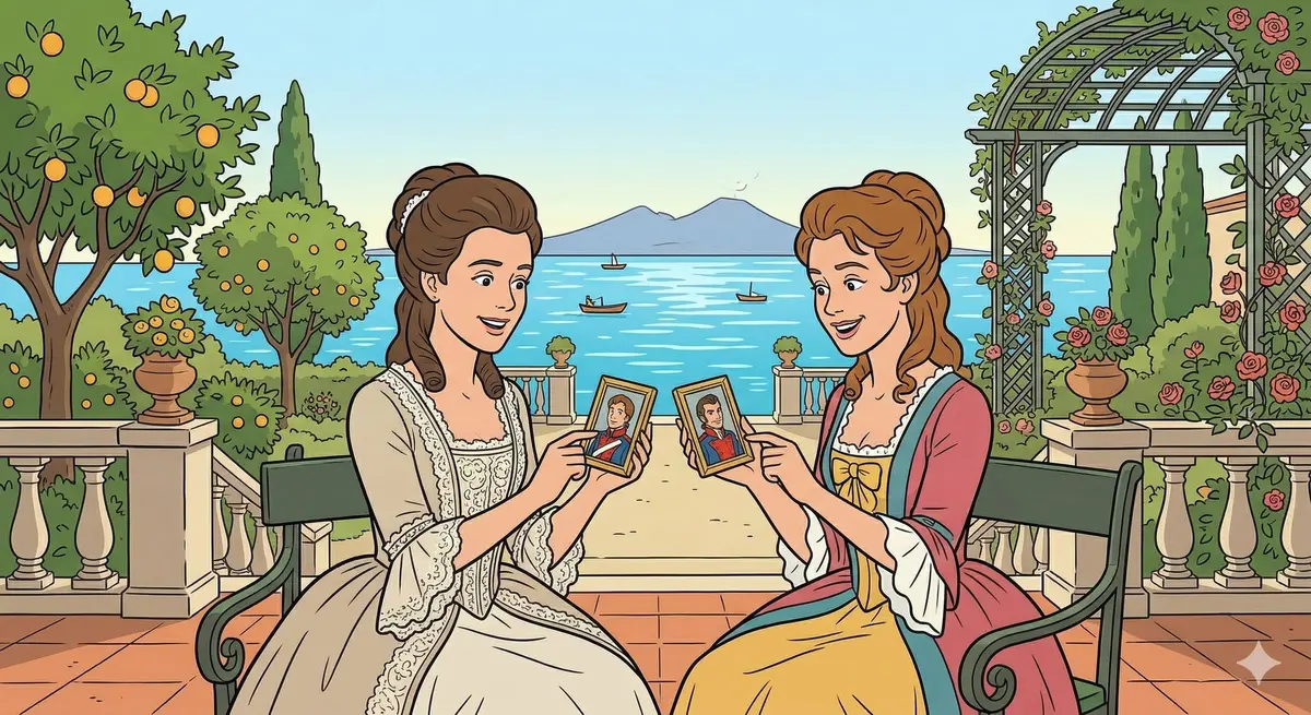 In a sunlit garden overlooking the Bay of Naples, the two sisters Fiordiligi and Dorabella gaze rapturously at miniature portraits of their lovers. In the lilting duet "Ah guarda sorella," they compare the fine features of their beloveds with breathless admiration, each insisting her officer is the handsomer. Their happiness is radiant and absolute, their faith in love unshakeable. This tender scene of innocent devotion establishes everything that Don Alfonso's cruel experiment will put to the test.